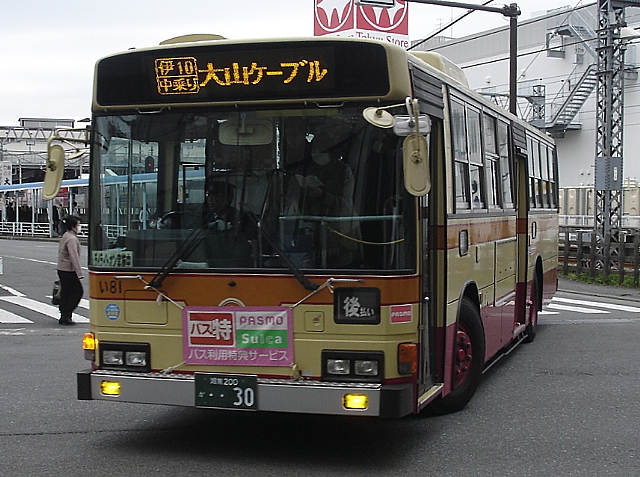 いすゞの大型路線バス「キュービック」です。神奈中独特の仕様である「運賃幕」(運賃支払方法が表示されている幕)が前面左側についています。