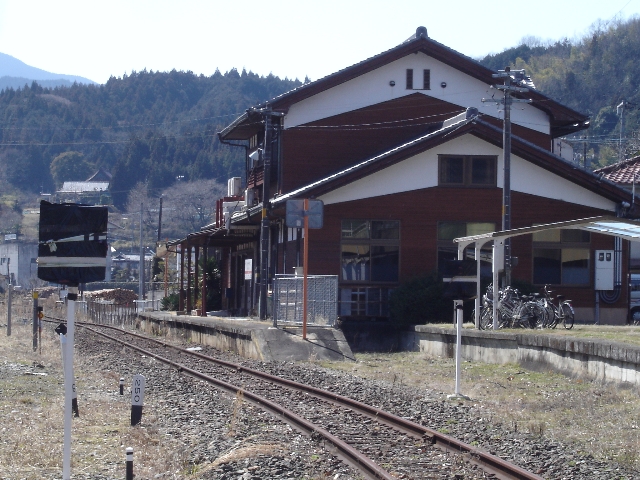 家城駅です。鉄道区間は家城駅までで、伊勢奥津方面へは駅前から発着する代行バスの利用になります。